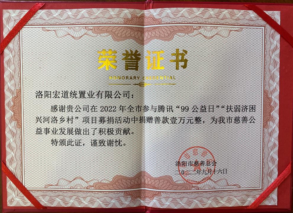 2022.9.22洛陽宏道統(tǒng)置業(yè)有限公司參與“99公益日”捐贈善款壹萬元整,獲得洛陽市慈善總會捐款榮譽(yù)證書。